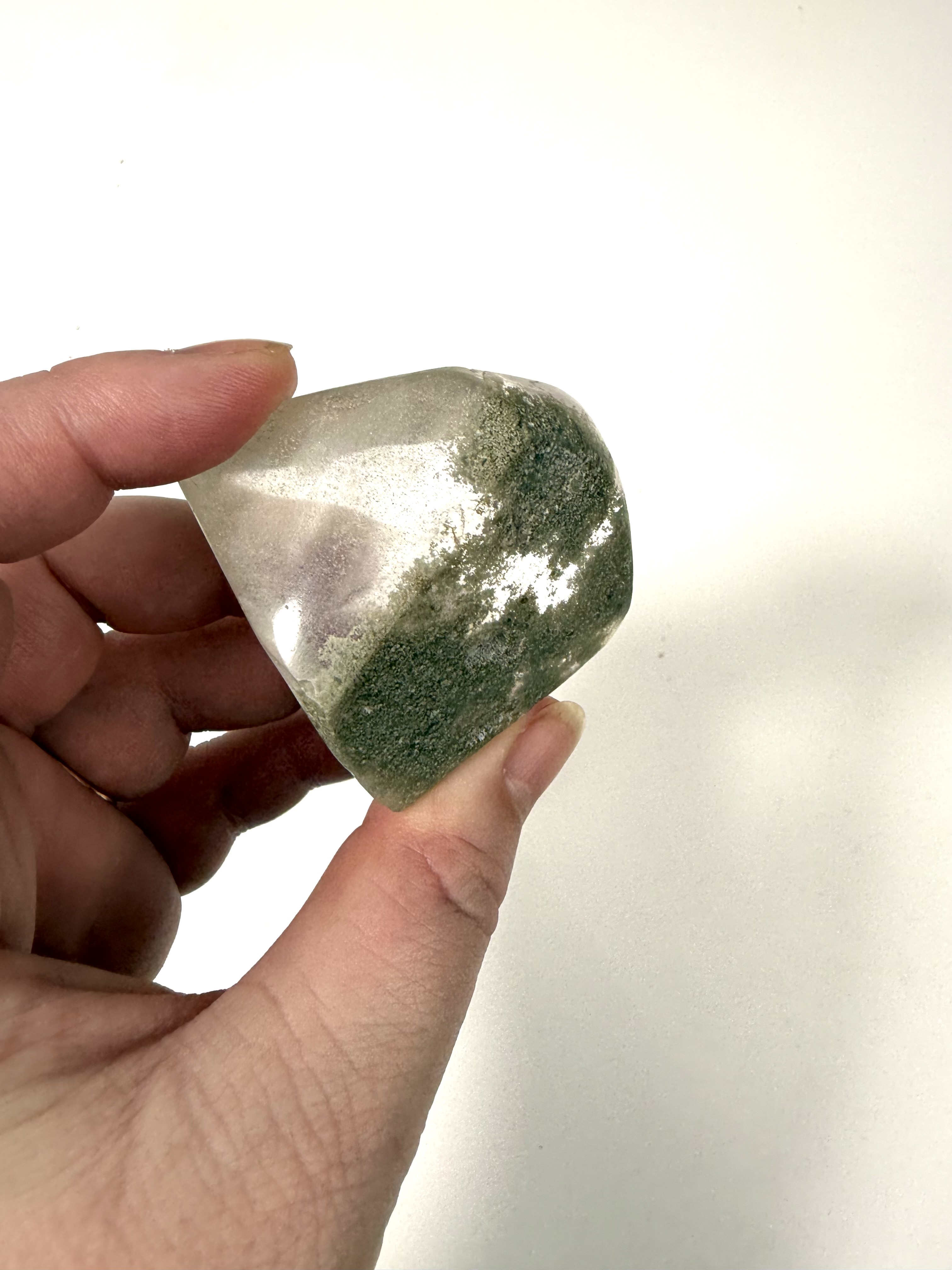 Phantom kvart også kaldet spøgelses kvarts, har fået sit navn, på grund at sit tåget, drømmende udseende. Den dannes ved at en anden krystal bliver forstyrret i sin vækst, og det siges derfor at Phantom kvarts har et spøgelse med fra den anden krystal. Phantom kvarts er en stærk spirituel sten, der er forbundet med dit krone chakra, den hjælper dig med at åbne, og arbejde med det spirituelle. Phantom Kvarts har en healende effekt både på det fysiske og psykiske.  Phantom kvarts er fantastisk til selvudvikling, da den hjælper os med at se indad, og konfronter vores spøgelser.