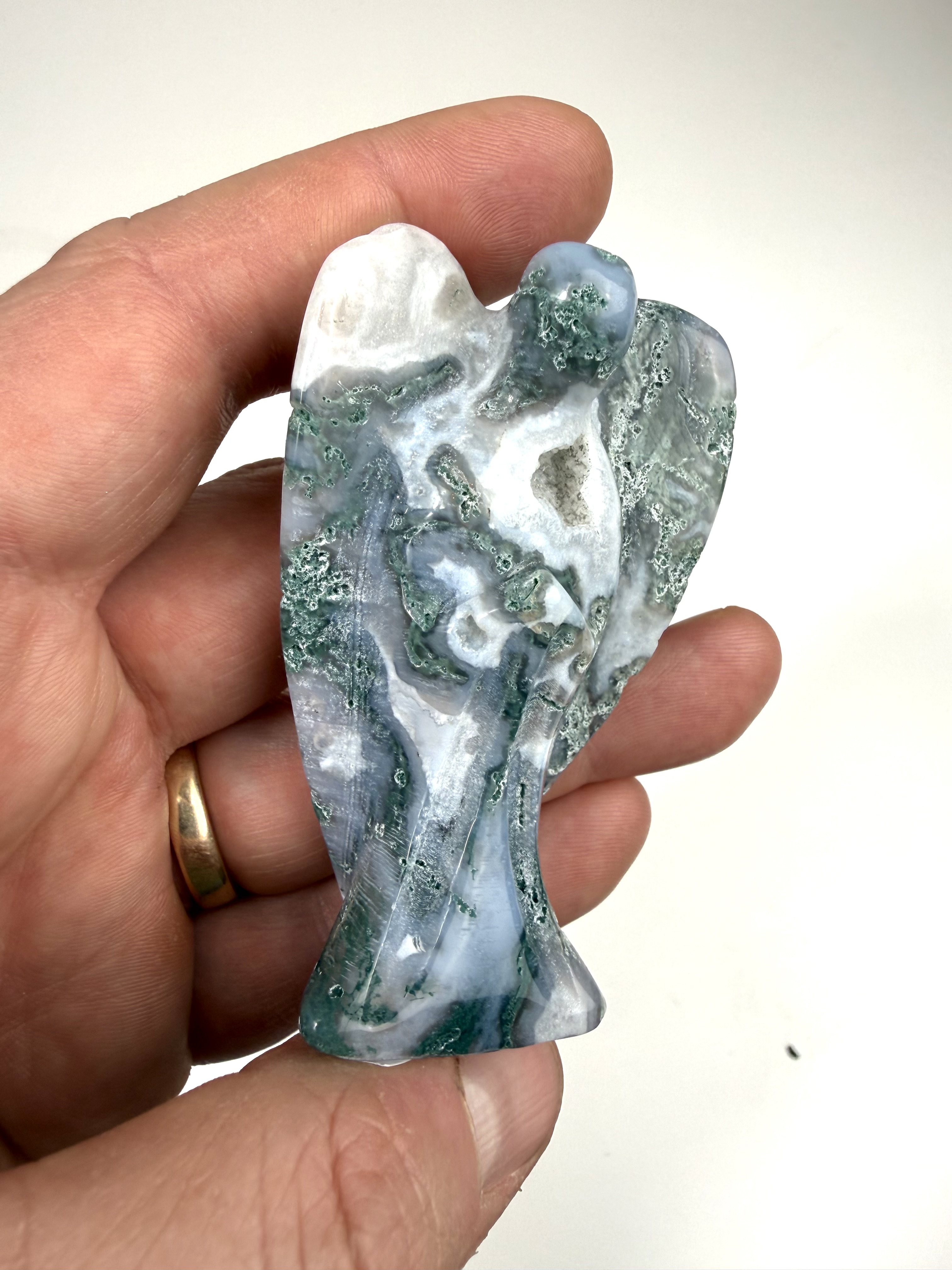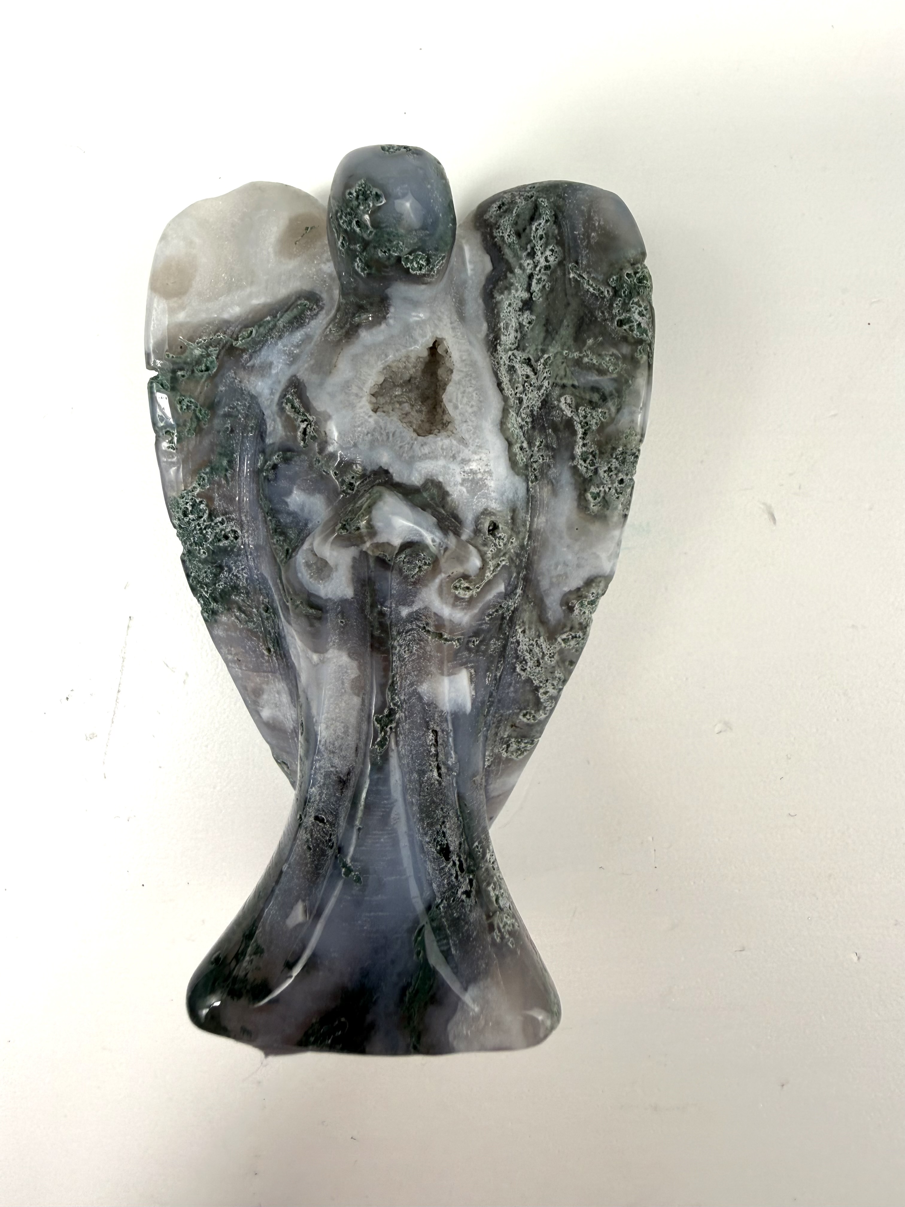 Mos agat er en sten, hvis energi styrker vores selvtillid og selvaccept. Den giver os tryghed og velvære, samtidig med at den støtter og styrker vores jordforbindelse. Den fortæller os at det trygt at lukke op for vores følelser, vise dem og udtrykke dem. Har man i perioder følt at alting gik os imod, vil mos agat samle og afbalancerer os, og give os nyt mod og viljestyrke til at komme videre.