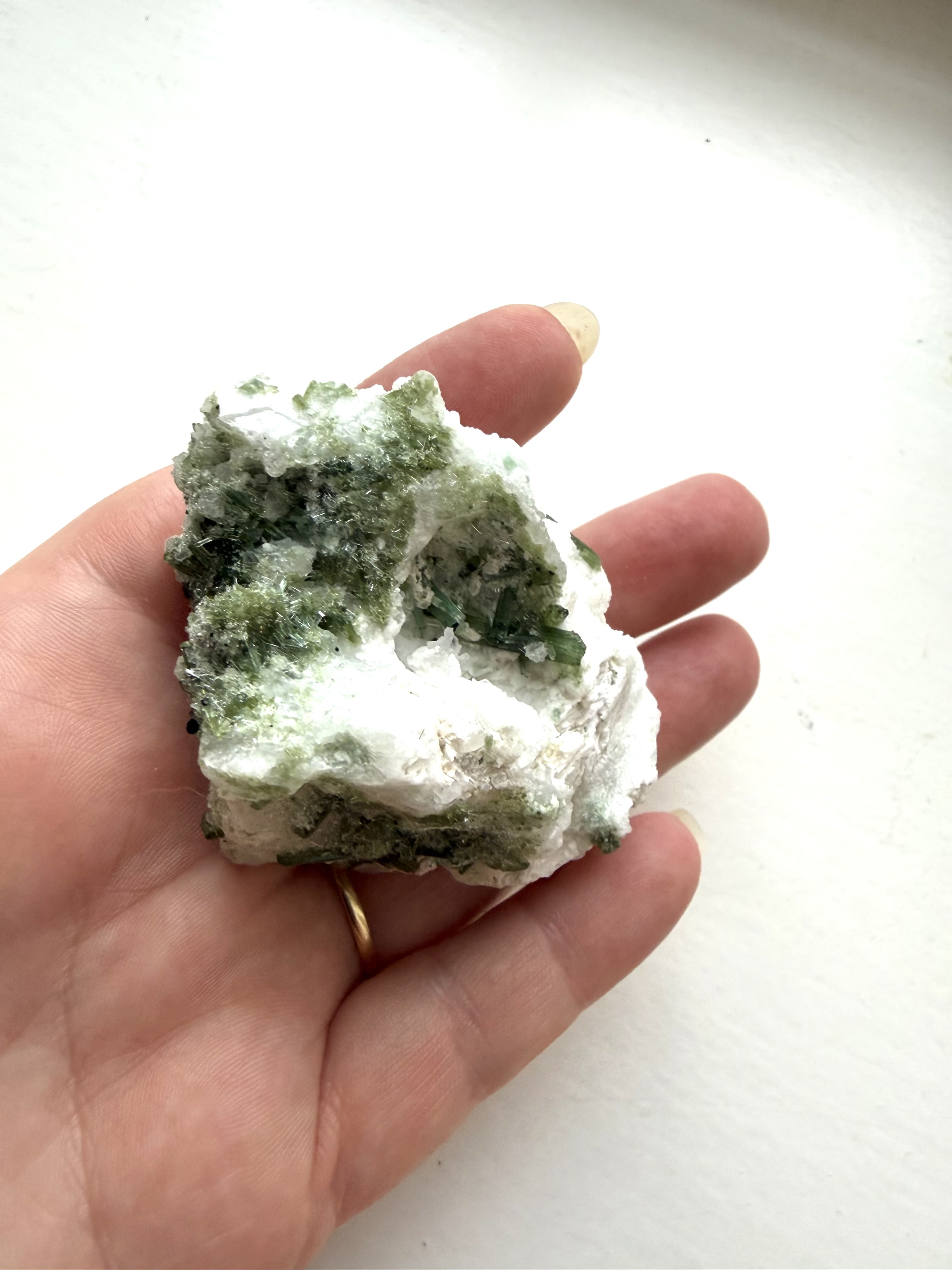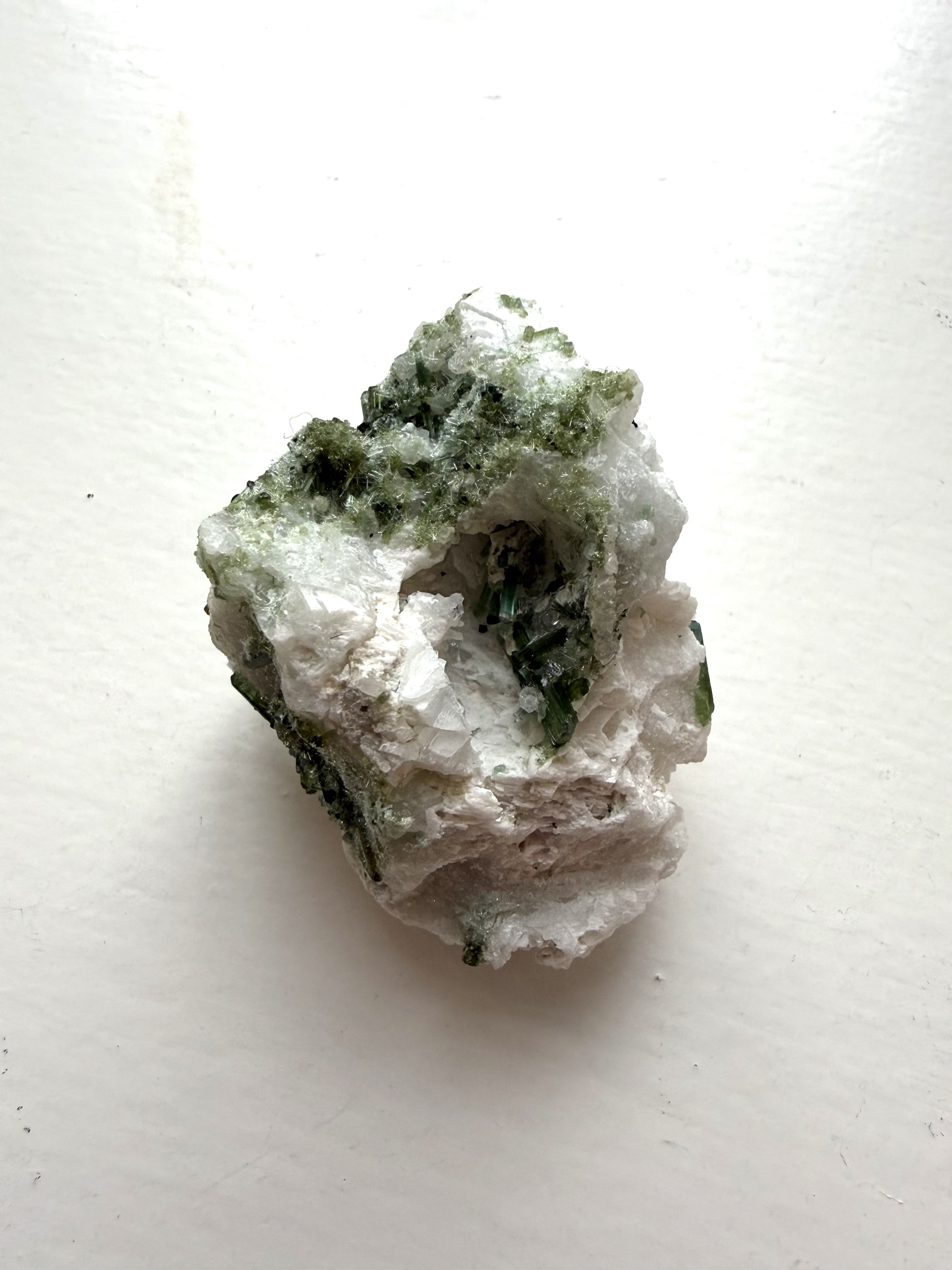 Grøn turmalin i kvarts arbejder med hjerteenergien og støtter dig i at skabe følelsesmæssig balance. Grøn turmalin i kvarts kan hjælpe med at åbne op for selvkærlighed og give klarhed i både tanker og følelser. Kombinationen af grøn turmalin og kvarts virker harmoniserende og styrker din forbindelse til dig selv.