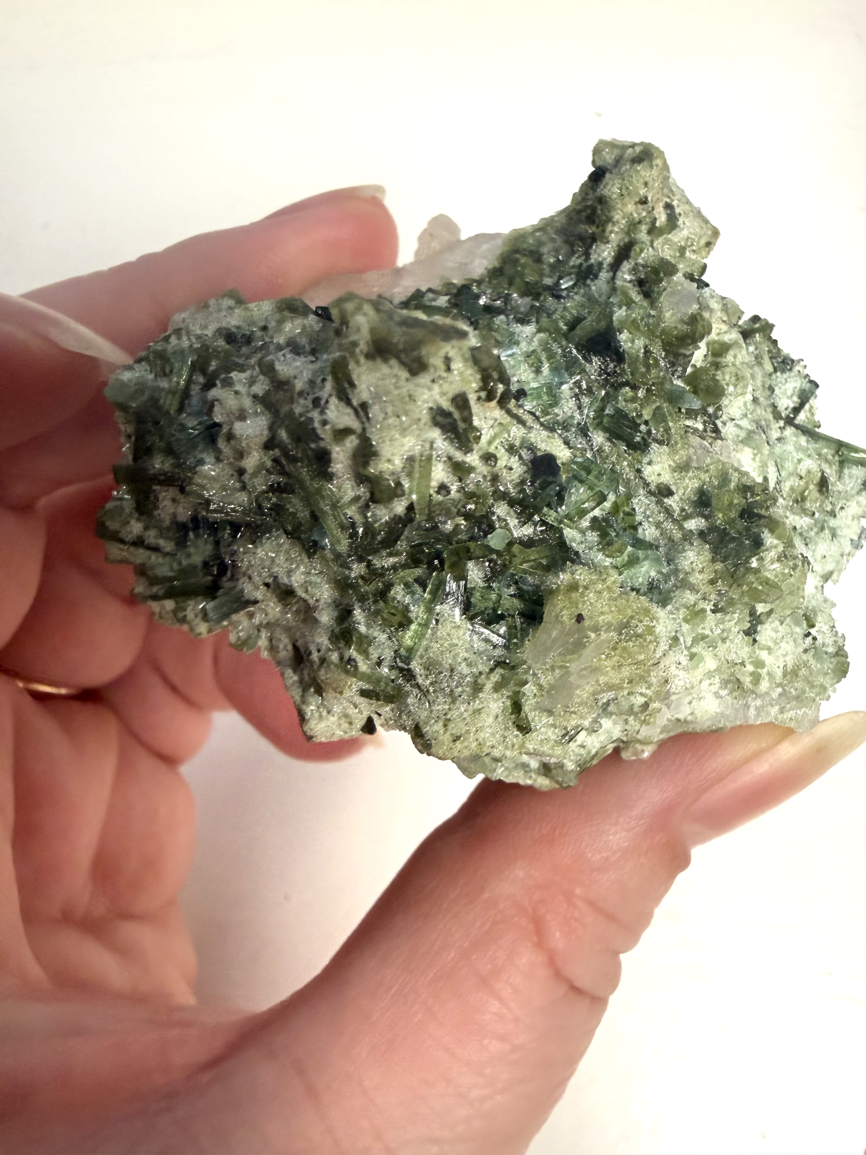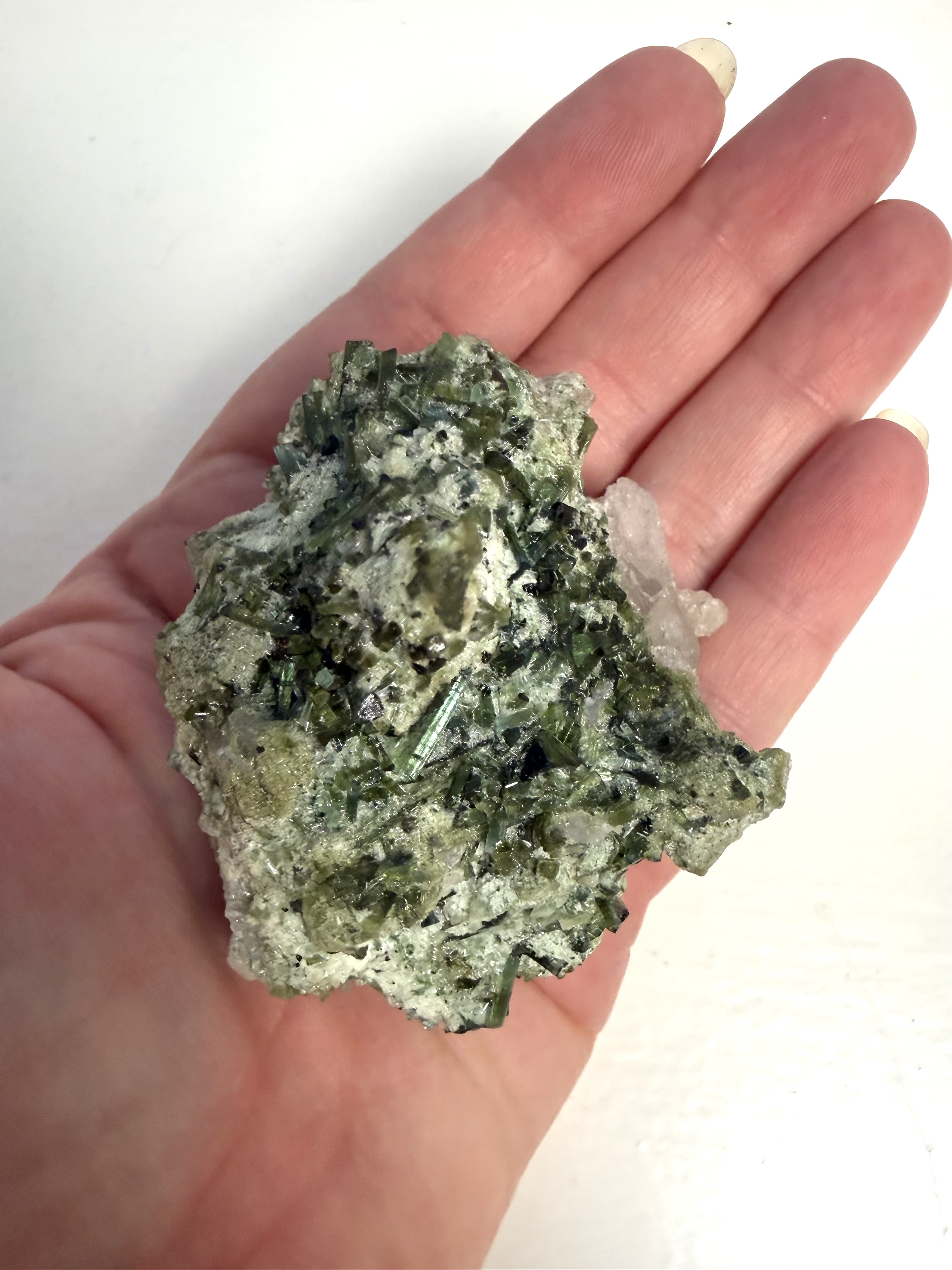 Grøn turmalin i kvarts arbejder med hjerteenergien og støtter dig i at skabe følelsesmæssig balance. Grøn turmalin i kvarts kan hjælpe med at åbne op for selvkærlighed og give klarhed i både tanker og følelser. Kombinationen af grøn turmalin og kvarts virker harmoniserende og styrker din forbindelse til dig selv.