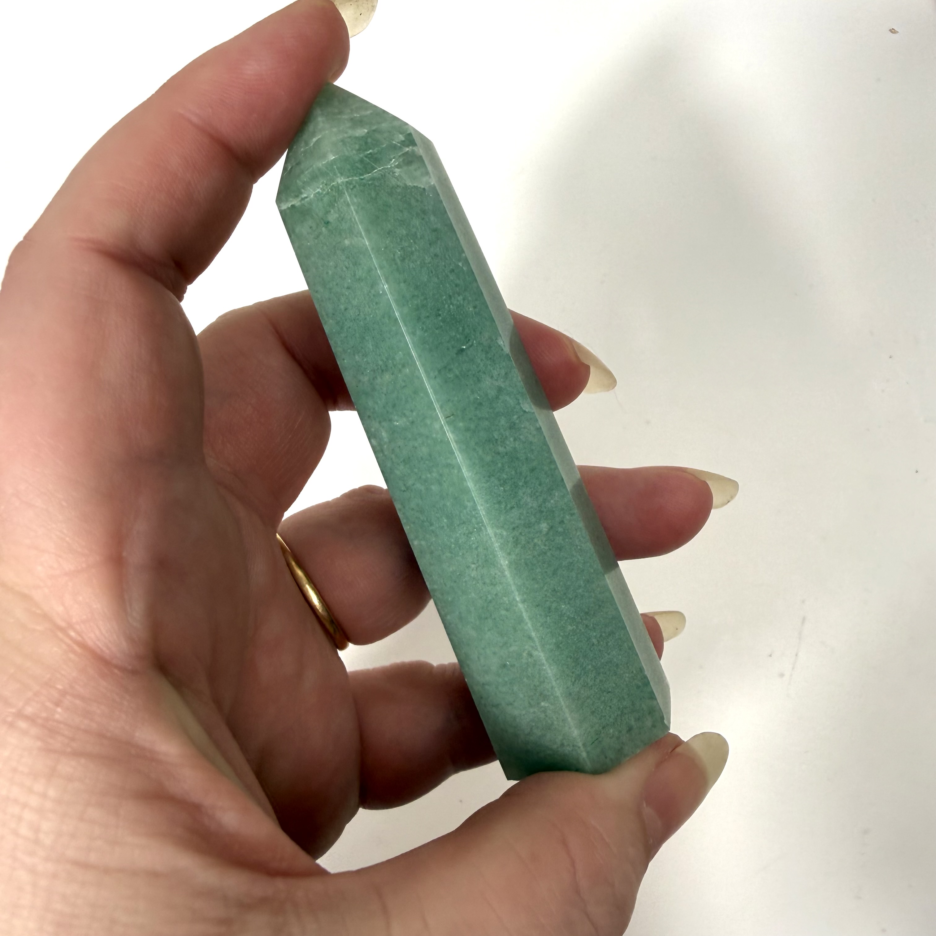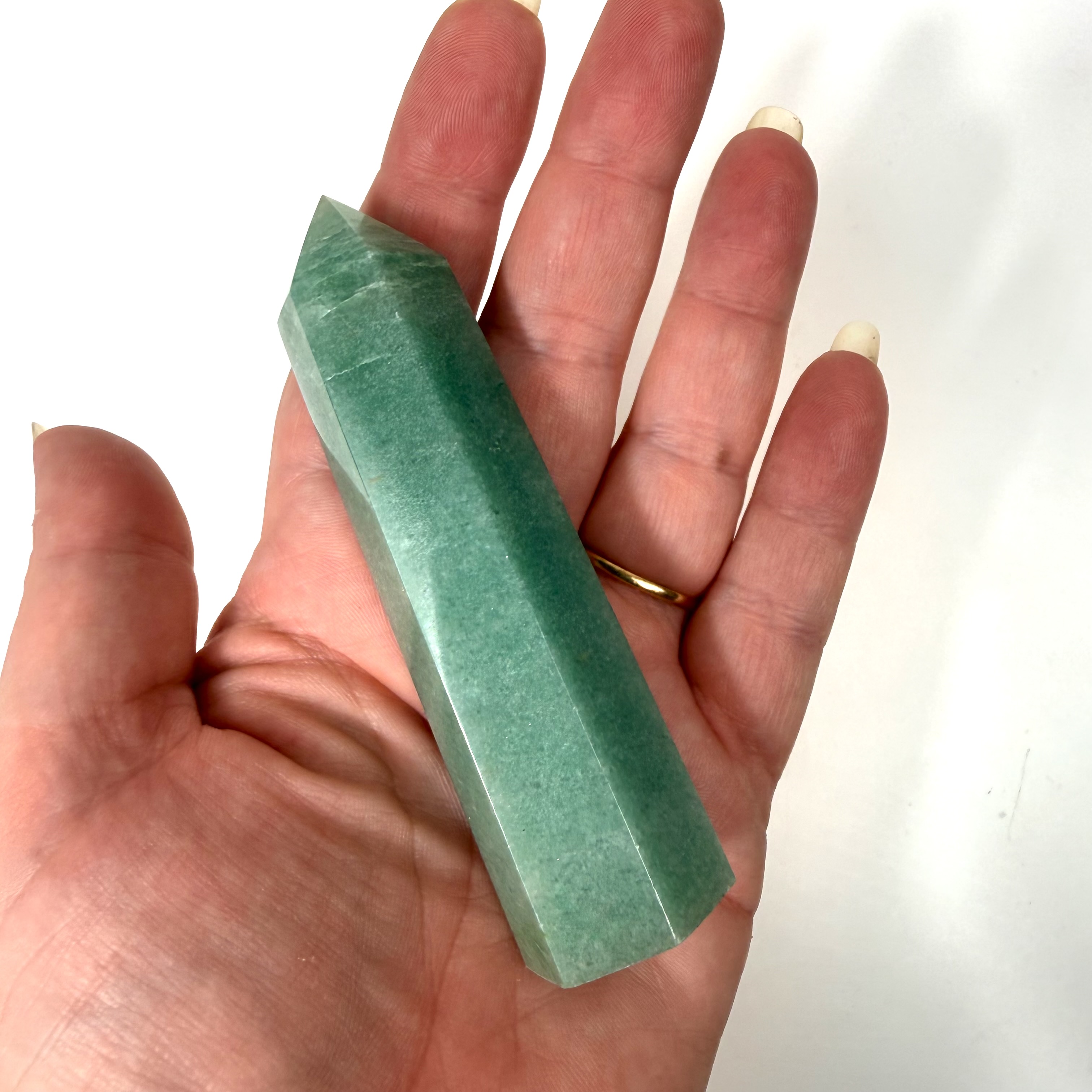 Grøn aventurin er en blid og harmonisk krystal med en smuk grøn farve, som forbindes med vækst, balance og nye muligheder. Den kaldes ofte for “heldets sten” og er kendt for at tiltrække positiv energi og åbne døre i livet.