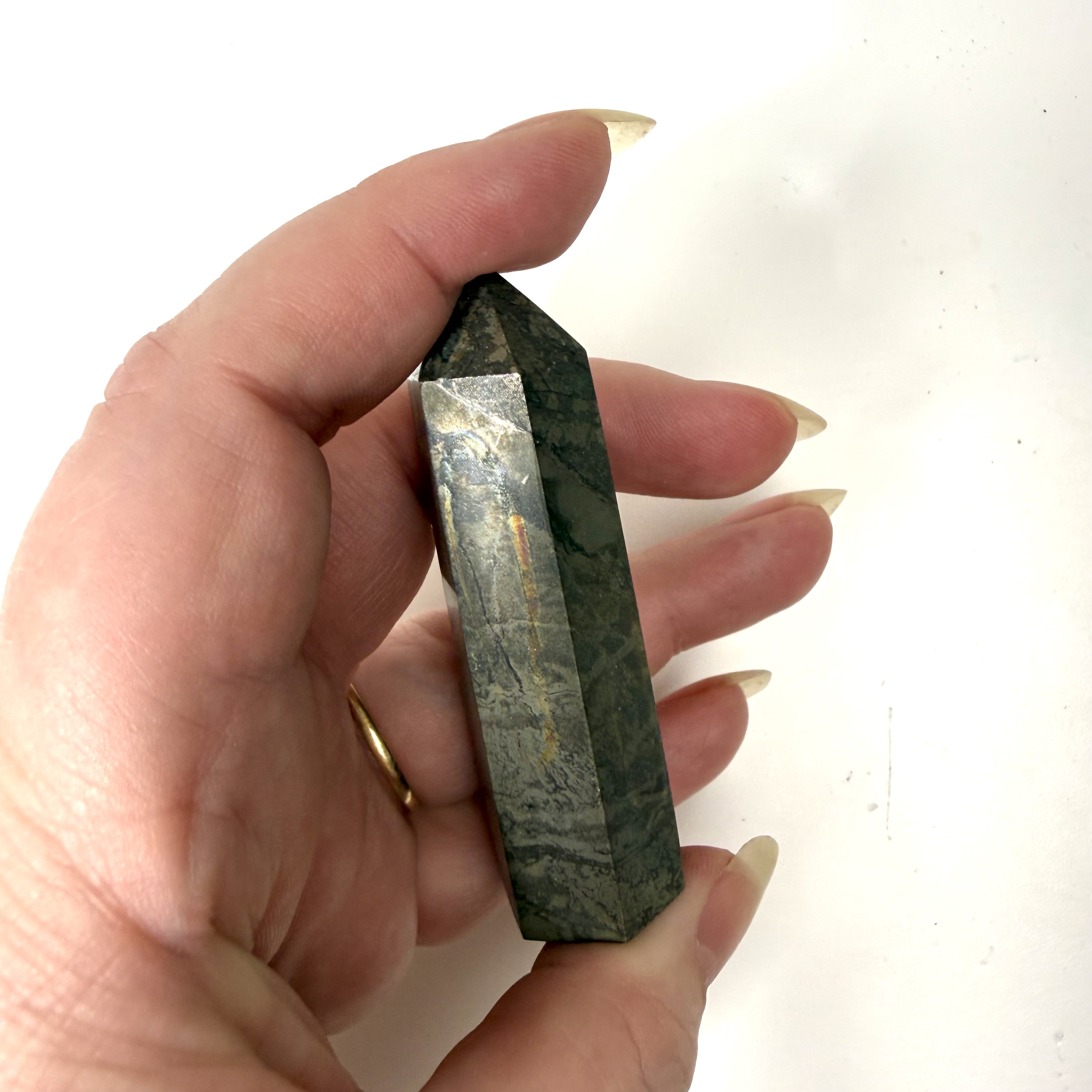 Denne rå pyrit er blandet med kvarts, det går den utrolig smuk, men også at egenskaberne fra Pyritten forstærkes.