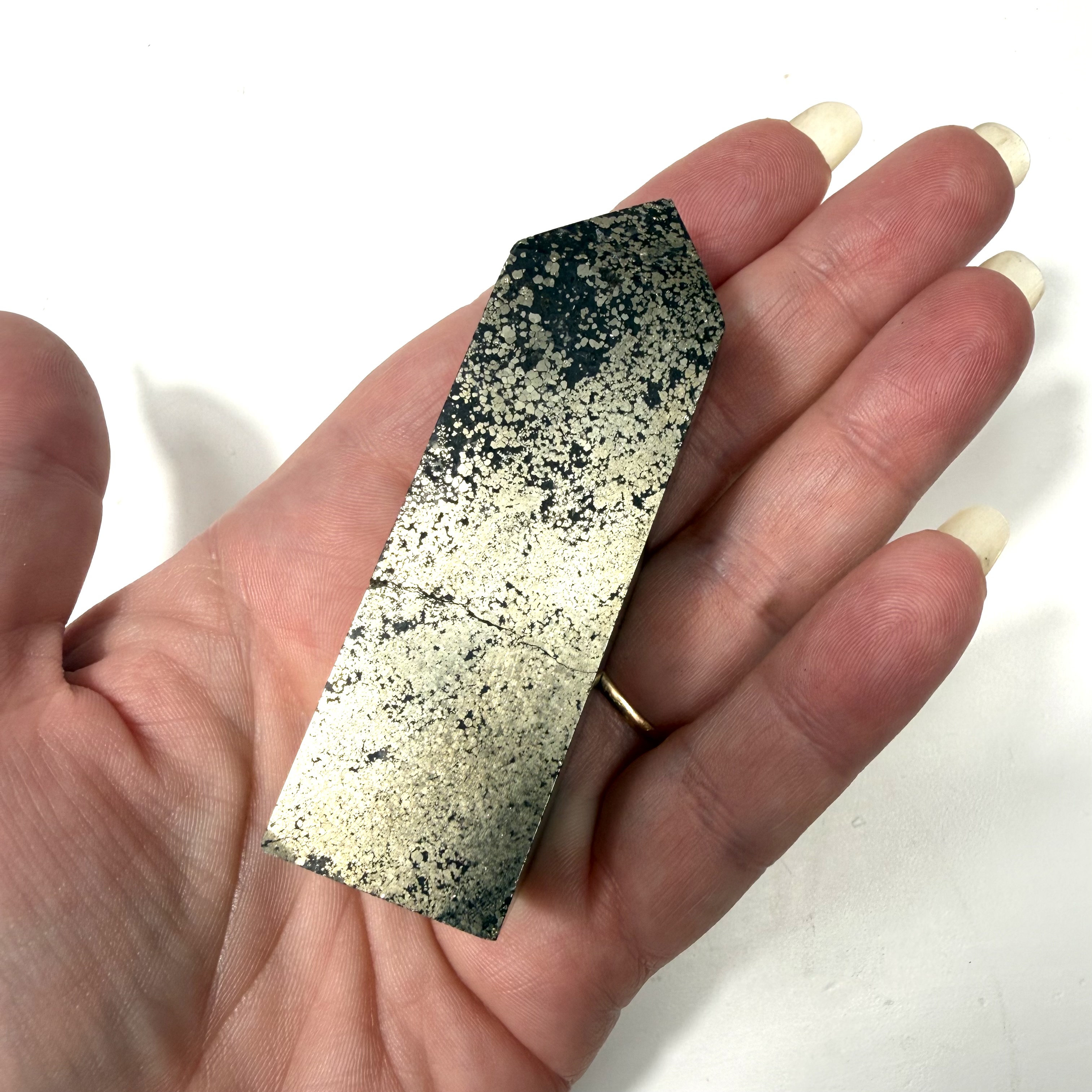 Denne rå pyrit er blandet med kvarts, det går den utrolig smuk, men også at egenskaberne fra Pyritten forstærkes.