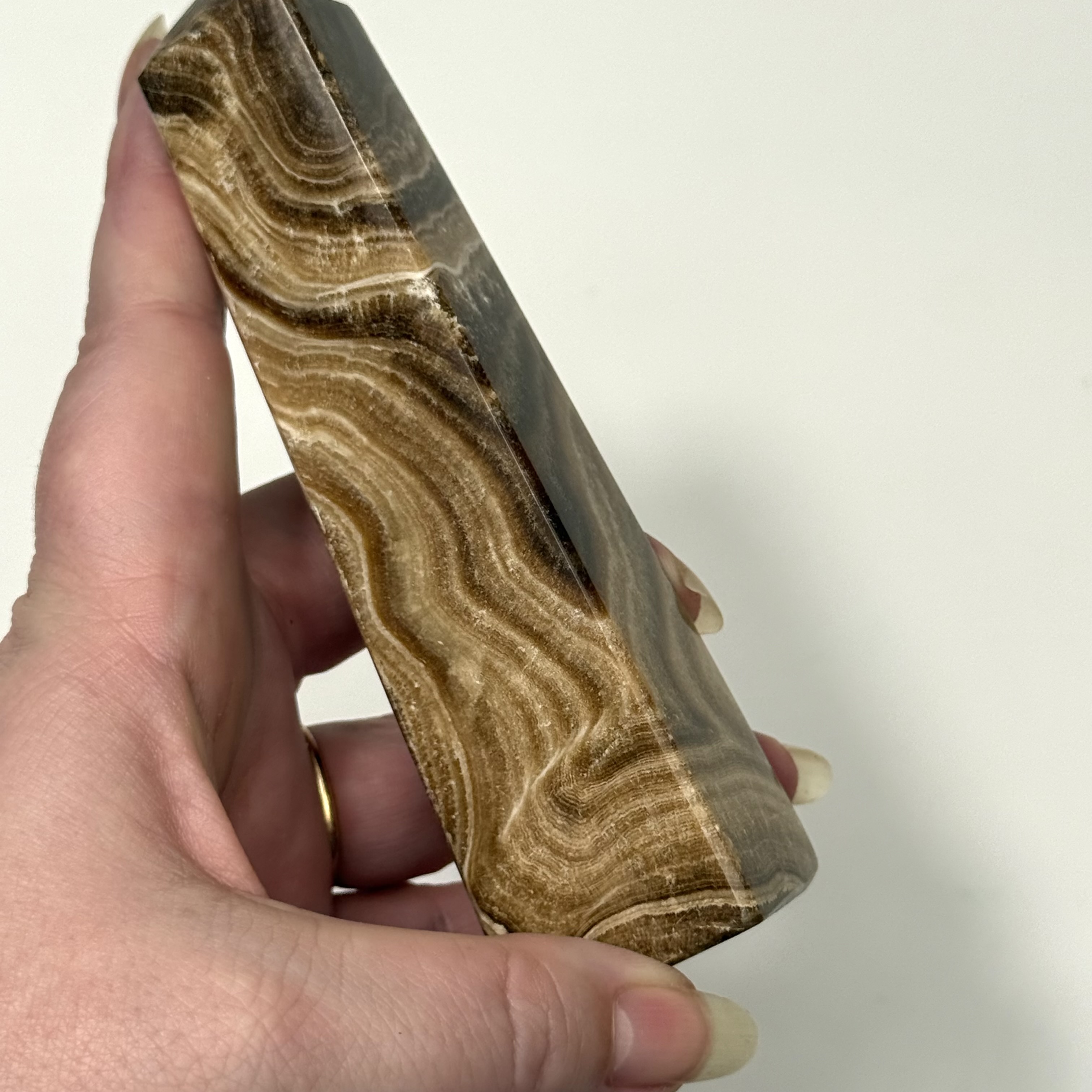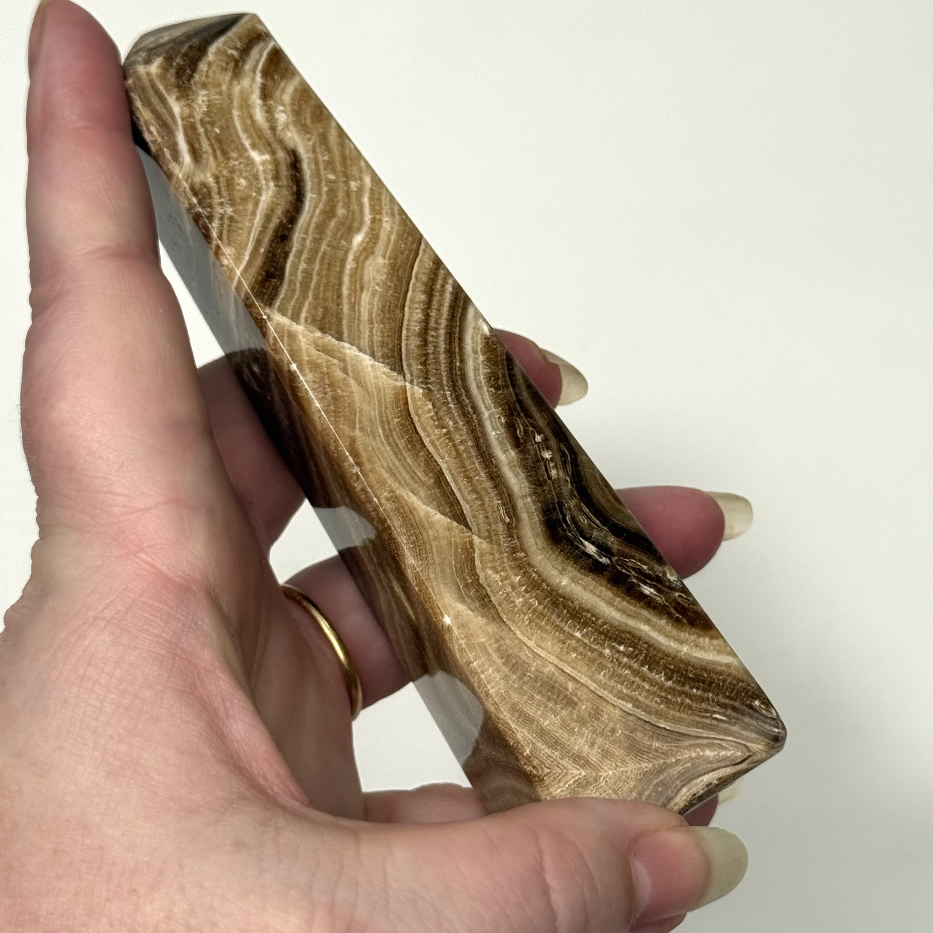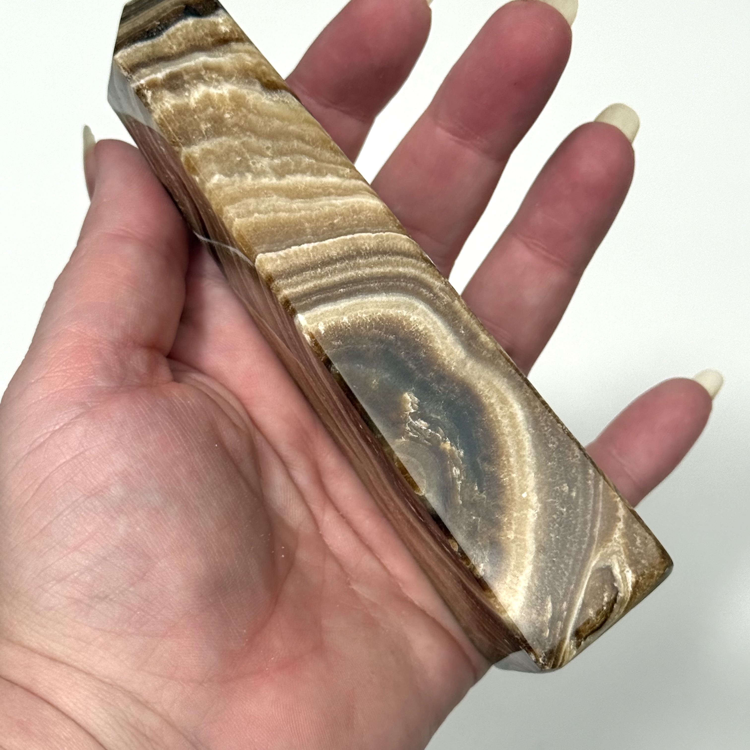 Chokolade calcit er en smuk og varm krystal med dybe brune nuancer, som leder tankerne hen på jord, styrke og stabilitet. Dens bløde farvespil giver en rolig og tryg energi, som hjælper med at skabe balance og grounding i en travl hverdag.