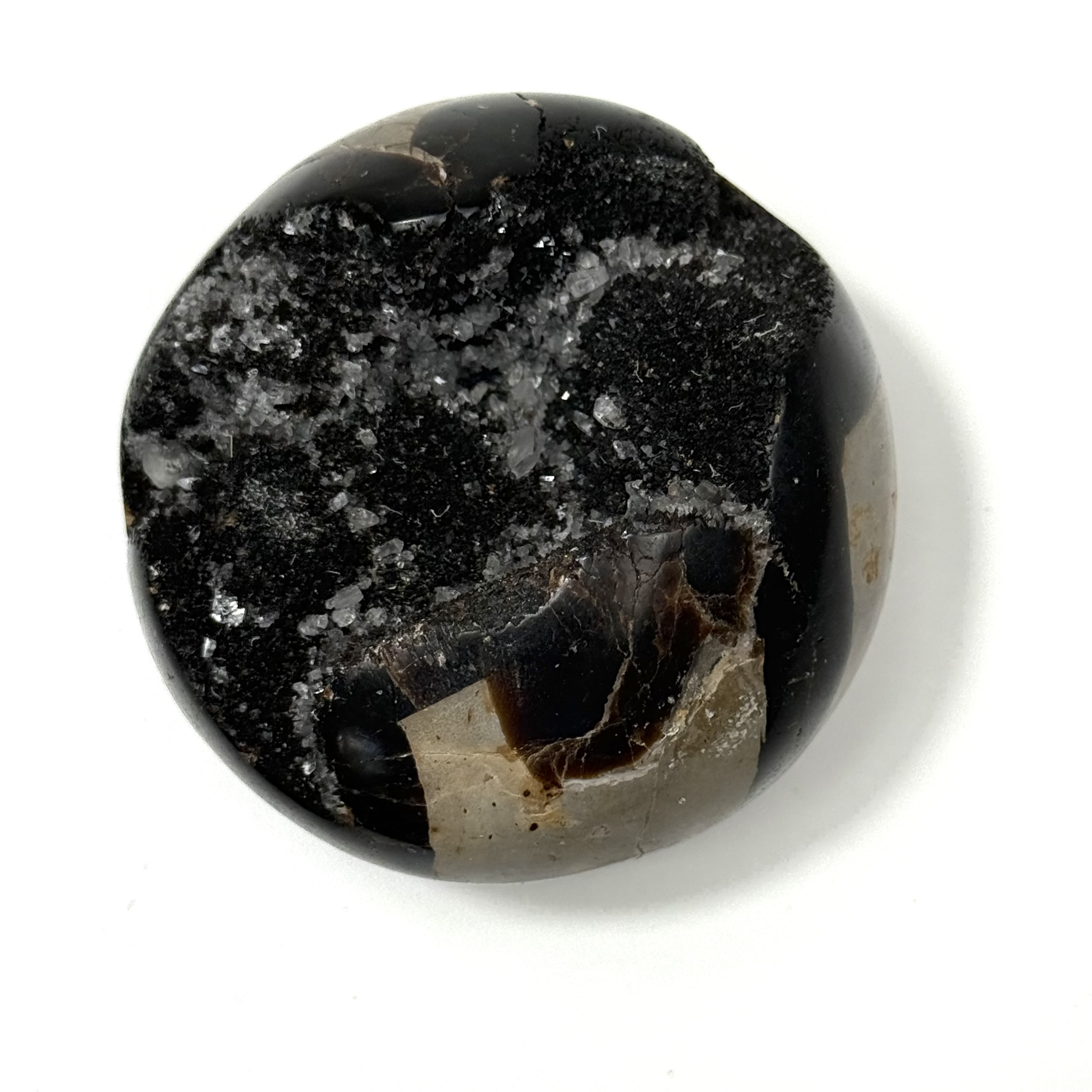Septarin med kvarts er en fascinerende og kraftfuld krystal, hvor septarinens varme, jordnære energi møder kvartsens klare og forstærkende vibration. De smukke mønstre og kontraster i stenen symboliserer samspillet mellem styrke og klarhed.
