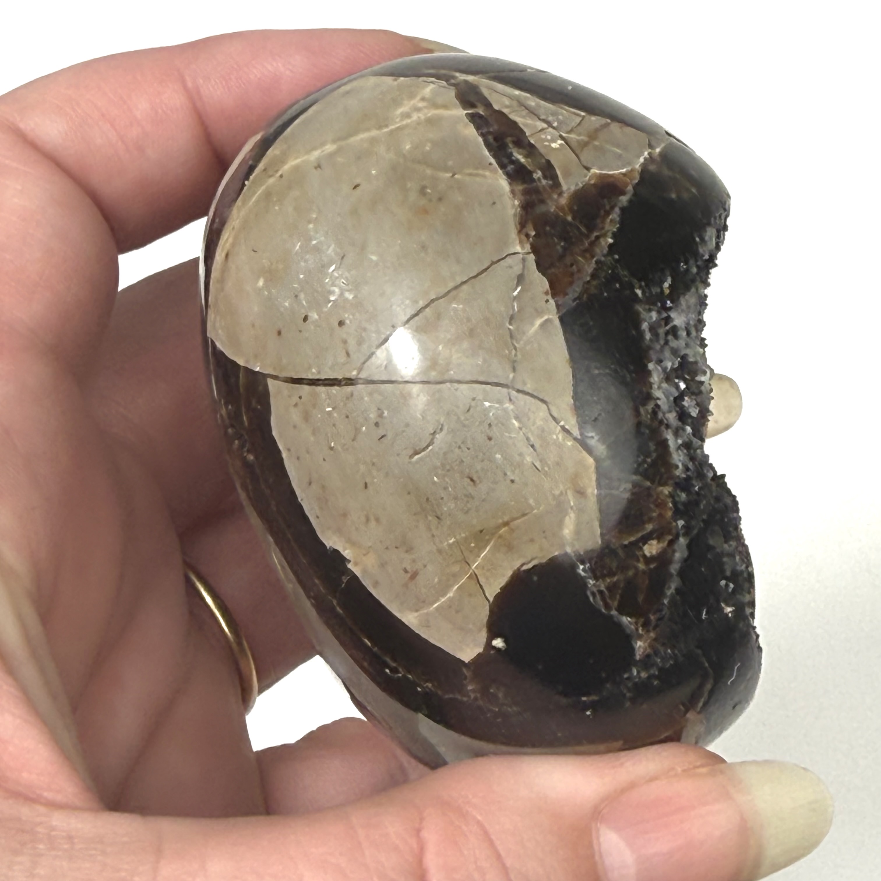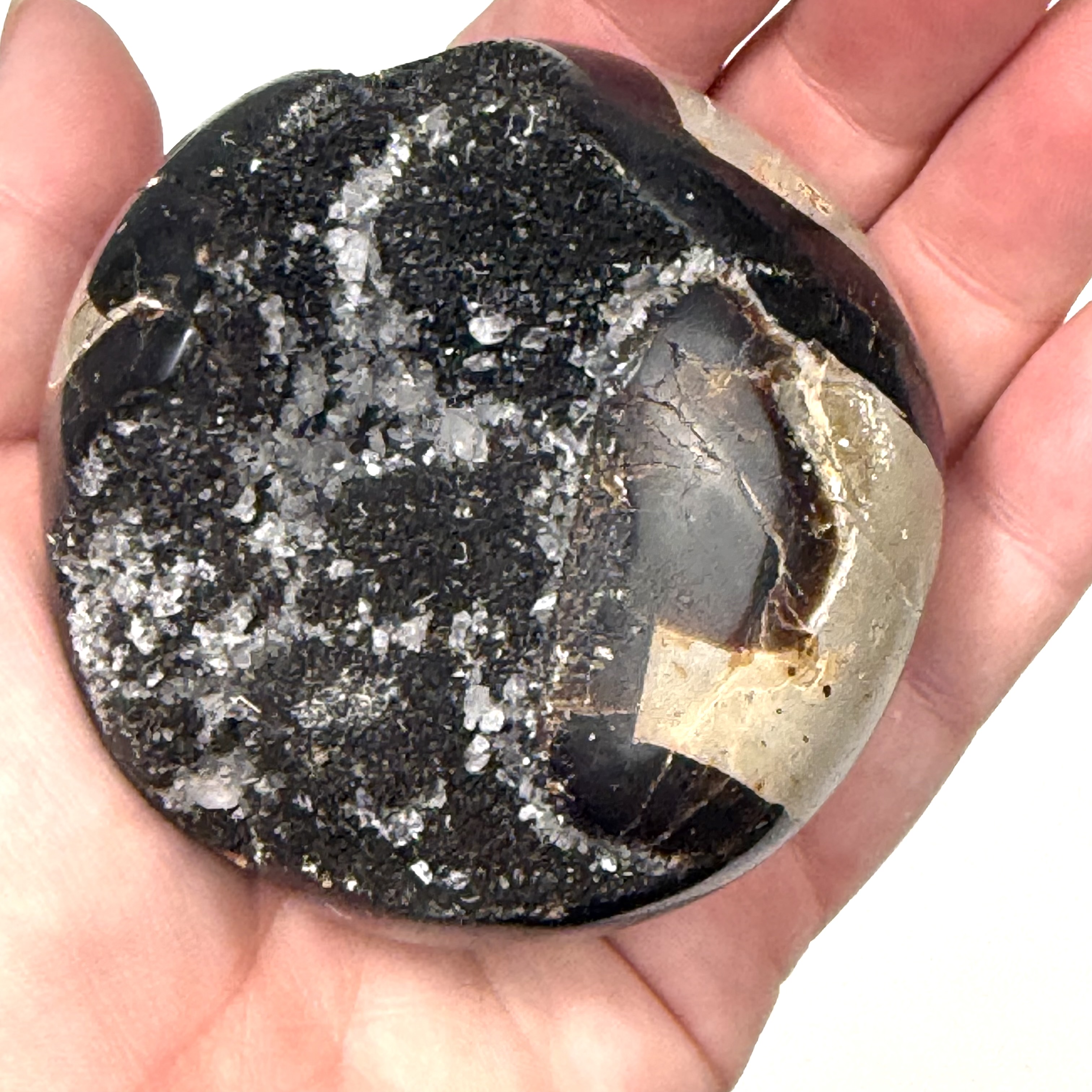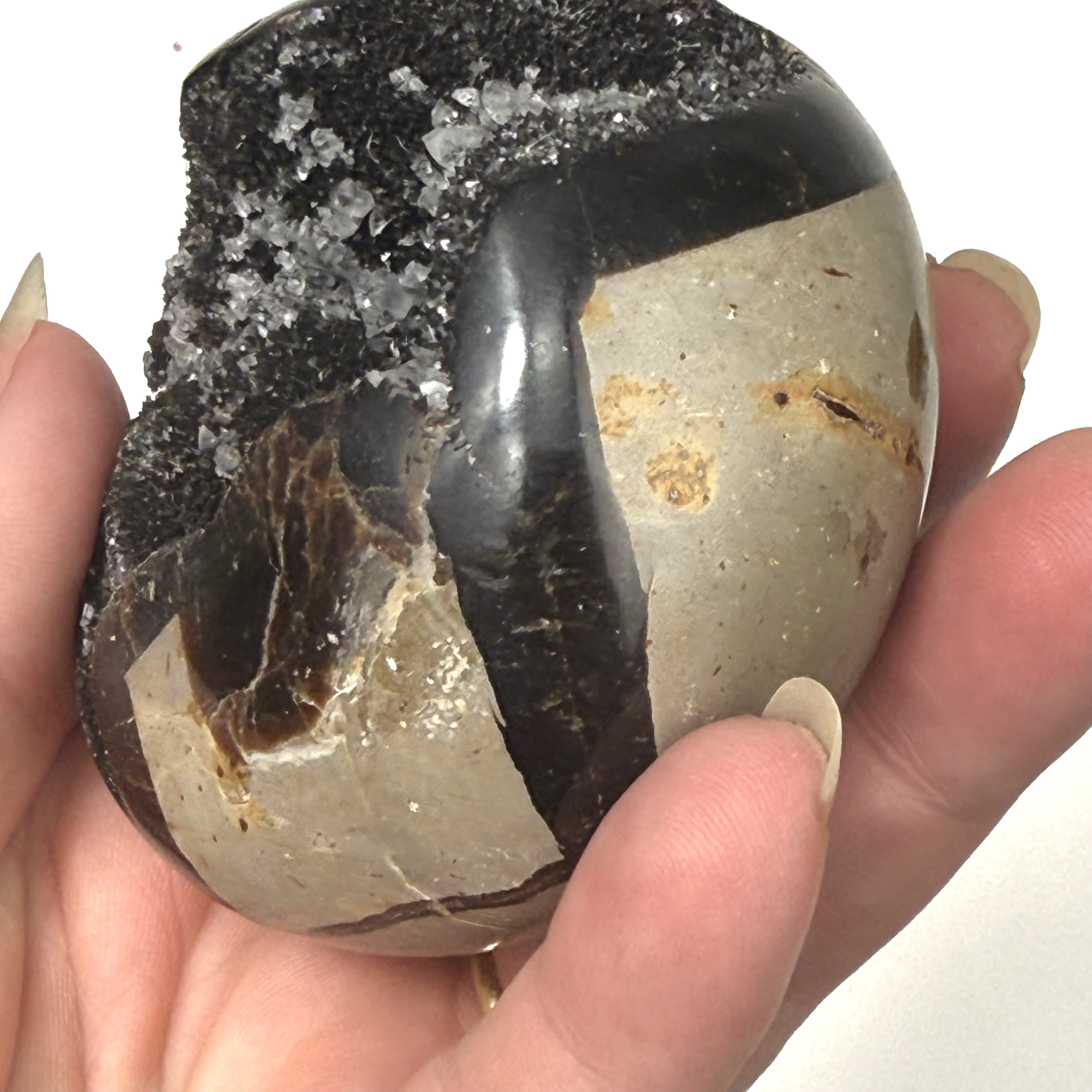 Septarin med kvarts er en unik og harmonisk krystal, som forener jordens stabilitet med kvartsens klare energi – en smuk påmindelse om, at styrke og klarhed går hånd i hånd.